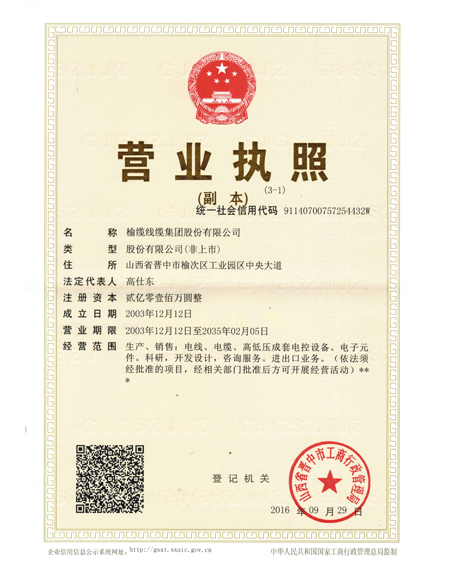 榆缆线缆集团股份有限公司始建于1958年,公司位于山西省晋中市榆次工业园区中央大道,公司拥有注册资金2.01亿元,年生产、销售能力30亿元。主要从事电线、电缆、高低压成套电控设备、电子元件等产品研发、生产、销售,同时涉足房地产开发服务、科研、开发设计、咨询服务等业务,公司于2012年6月在天津股权交易所挂牌上市。